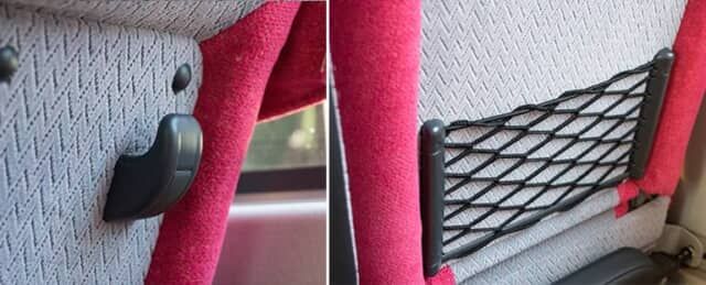 バス旅で役立つフックと網ポケット。あらかじめフックにかけておくものと、網ポケットに入れておくものを出しておくと便利です。