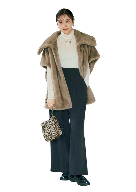 毛足の長いファーの浮かれ感は、ベーシックカラーで落ち着かせるのが正解!ヘルシーにアカヌケて、日常をドラマティックに変える装いに。