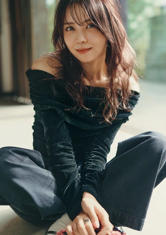 思いきった肩出しも、定番カラーならトライしやすい。ベロアの光沢感を味方に、カジュアルすぎない大人な着こなしを。