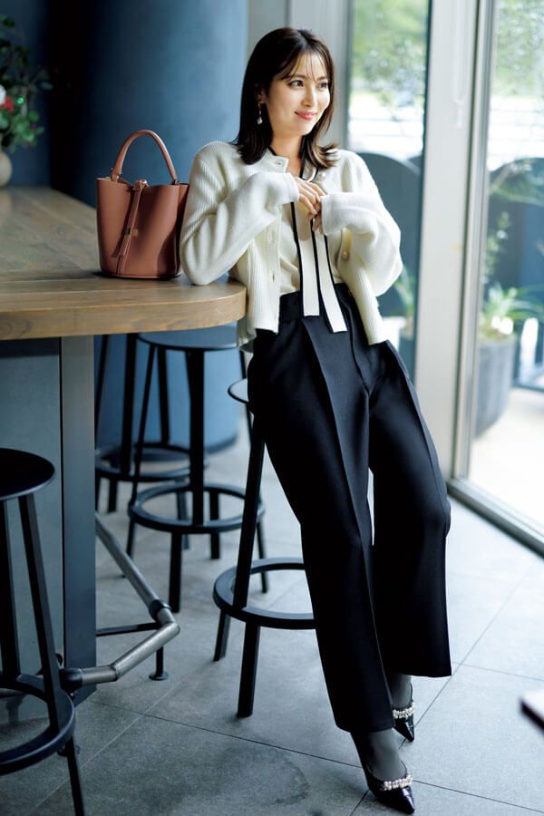 腰〜膝にかけて膨らむカーヴィーパンツで、気になる太ももまわりをカバー。センタープレスのストレートパンツで脚長効果を意識して。首元から配色ボウタイをのぞかせてリュクスな佇まいに。