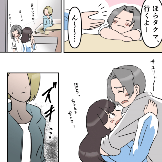 「ほらタクマ行くよ」と、渋々タクマを支えて部屋へ向かうサユリ。
