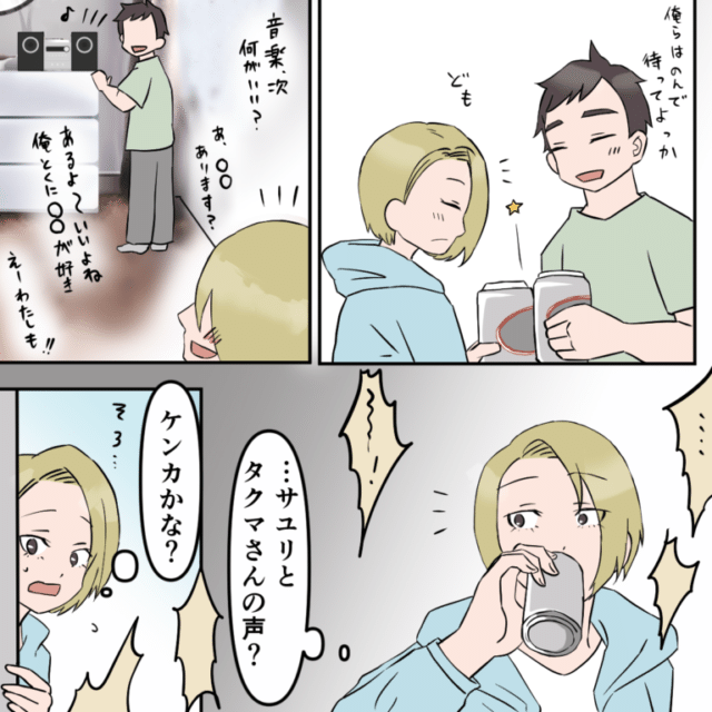 部屋に残ったカズヤと飲み始めたアユは、音楽の話で気が合うことがわかり、楽しく飲み始めたところでタクマとサユリの言い争う声が聞こえてきました。