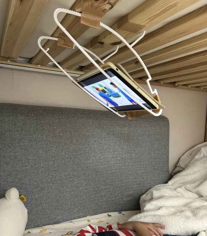 この投稿に「賢い!」「小1でこの発想力はすごい」などのリプライが寄せられました。一方、ベッドとの固定がガムテープであることで「落ちてきたら危ないかも」「結束バンドがいいですよ」などのアドバイスもありました。顔にタブレットが落ちてこないよう、対策をした上で活用できるとよさそうですね。