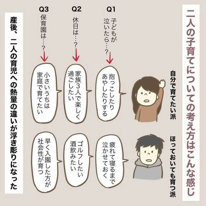 このお話はたまままさんがご自身の経験をもとに描いたエッセー漫画です。たまままさんと夫は育児への根本的な価値観が異なり、出産後にそれが浮き彫りになりました。