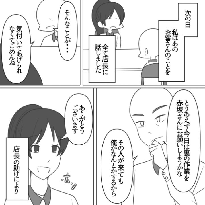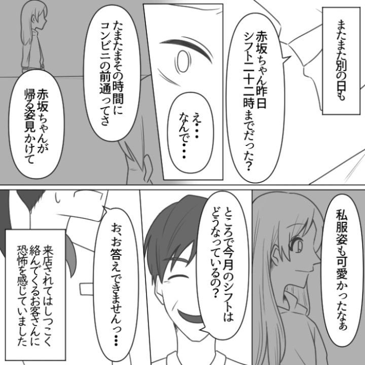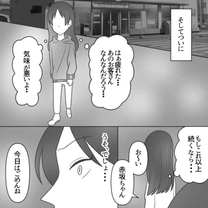 主人公はコンビニで働いていました。ある日そこにお客さんとして1人の中年男性がやってきます。何かを探しているようだったので、親切に案内した主人公。これが悲劇の始まりでした・・・。