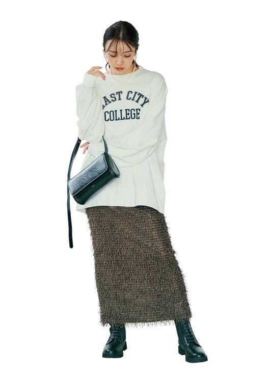 街にあふれるロゴスウェットをおしゃれに攻略するなら、素材のメリハリはマスト。シックな色みながら、キラキラ感のあるシャギースカートを投入して、さりげないセンスのよさをアピール。