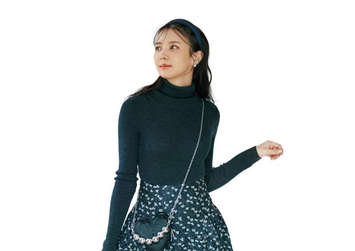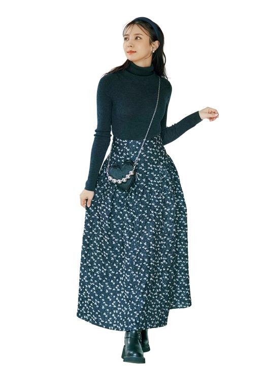 誰もが1枚は持っている黒タートルは、同色のジャカードスカートを合わせてマンネリ感を打破。素材感とシルエットの旬なバランスで、シックなのに華やかなスタイルが叶います。
