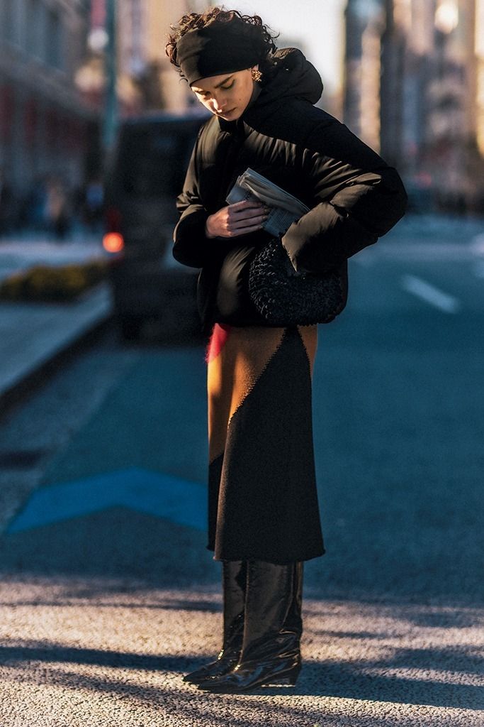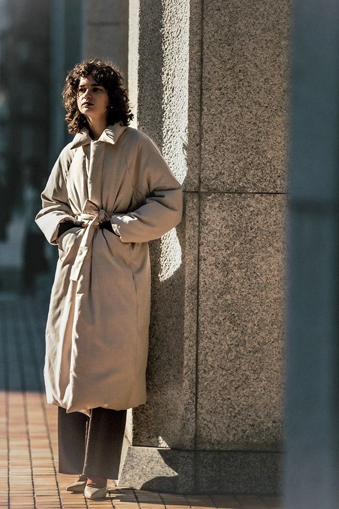 前をしっかり閉めて、アウターというよりトップスのように着てみる。フードもすそもしぼって丸みを持たせ、タイトスカートとのメリハリを。スポーティ感が気になるならば、ターバンやツヤありブーツでレトロに盛り上げる着方もあり。