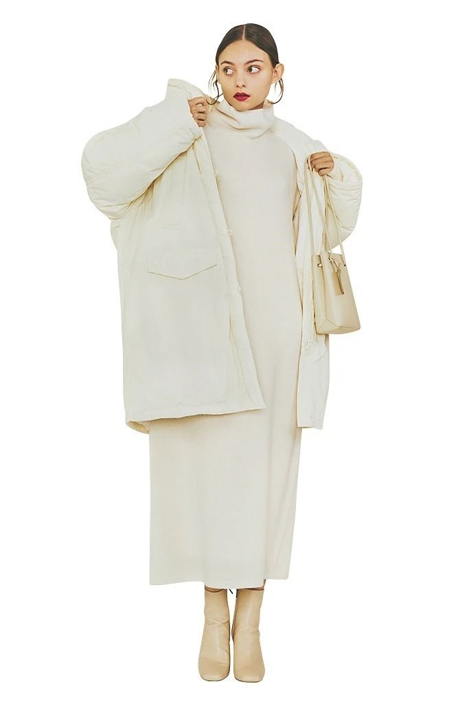 ダウンコートのメンズっぽさは、白で統一すれば上品なくずし役として作用。ハンパな丈感のコートは、同色のワンピースと合わせるとかえってウエスト位置が目立たず、縦に長い印象だけを残せる。