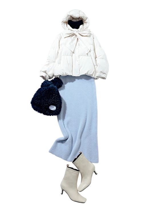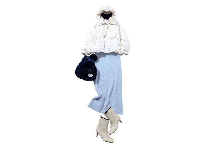 ショートダウンジャケット¥24,970/LILY BROWN(LILY BROWN ルミネエスト新宿店) タートルニット[一部店舗のみで販売]¥9,990/UNIQLO ニットセットアップ(スカート)¥11,000/e/rm(アダストリア) ボアバッグ¥12,100/スリードッツ(スリードッツ表参道店) ショートブーツ¥2,420/神戸レタス