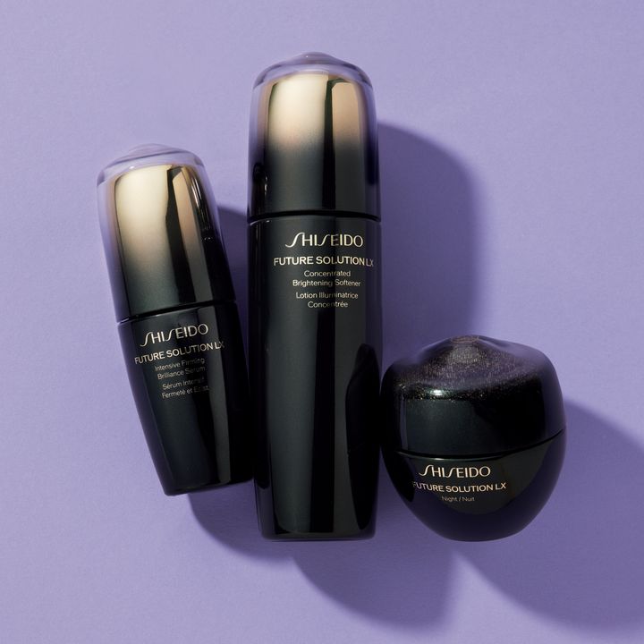 左から:使うほどに透明感&輝きがアップ。SHISEIDO フューチャーソリューション LX インテンシブ ファーミング ブリリアンスセラム[医薬部外品]50ml ¥31,900 コンセントレイティッド ブライトニングソフナー[医薬部外品]170ml ¥14,300 トータル Rクリーム 50g ¥37,400(すべてSHISEIDO)