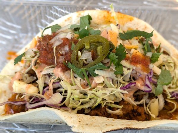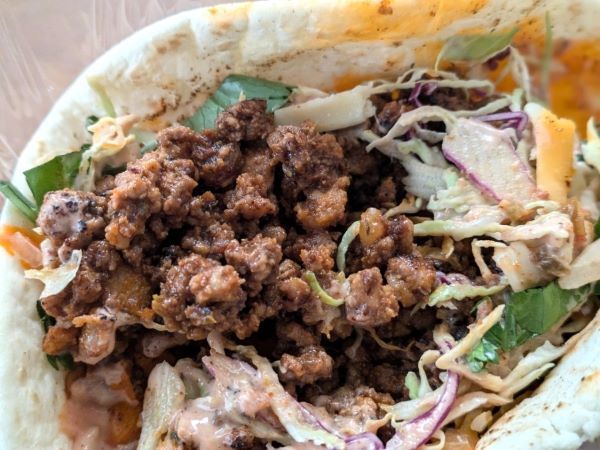 今回は、名物「タコライスをタコスにしてほしい」という要望から生まれた「チョップドミートタコス」(1個 750円)をいただいてみることにしました。後乗せのパクチーの有無は聞かれます。(今回は、パクチーあり)