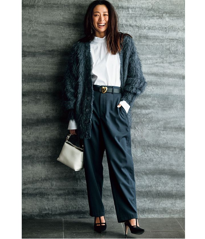 久々の同窓会でコーデに迷った時こそ、地味カラーの出番。シャギーカーデで柔らかな表情を加え、ハートバックルのベルトでさりげない可愛さもプラス。カラーレスでも素材とディテールだけで十分オシャレ顔に。一見ハンサムコーデなのに質感やモチーフ、甘テイストの自由なミックス感で女っぽさを補強。