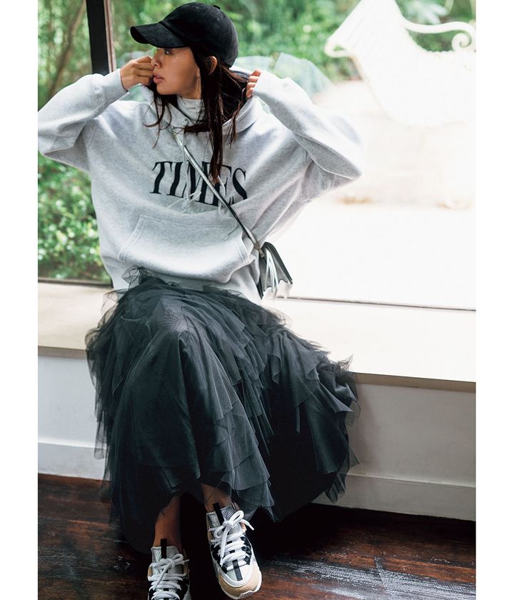 スカート自体がドラマティックだから、あえて女っぽく穿かずにカジュアル度を高めることで、却って女性らしさが引き立つんです。オフの日なら、このくらいの気分転換スタイルがちょうどいい!