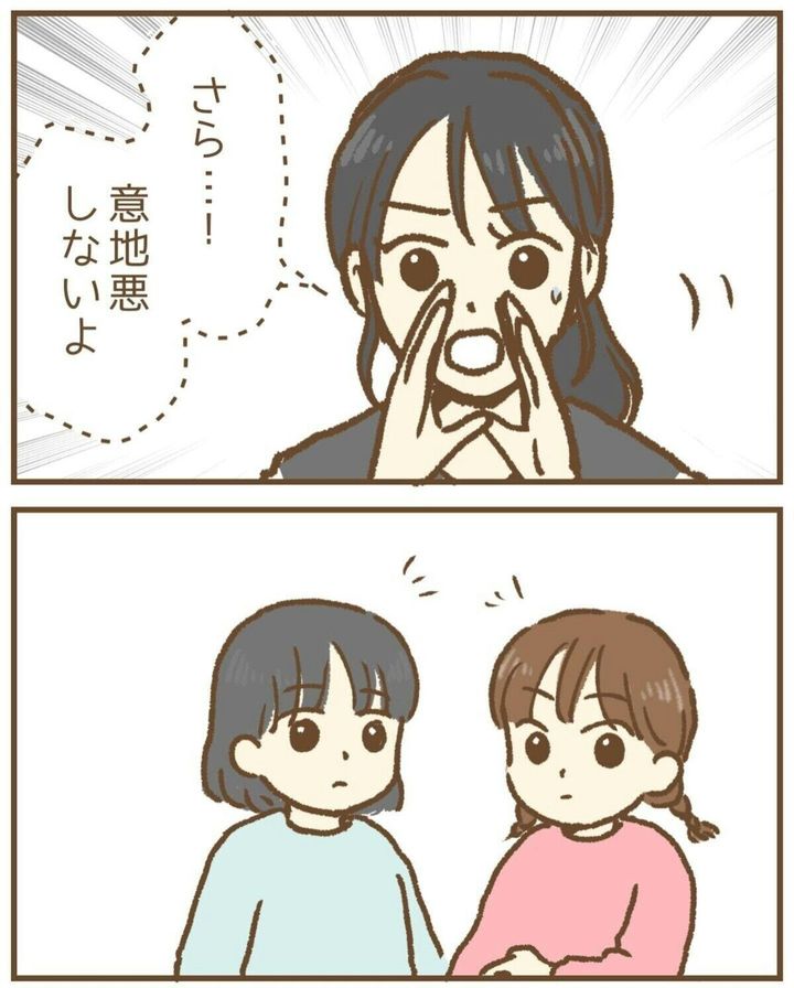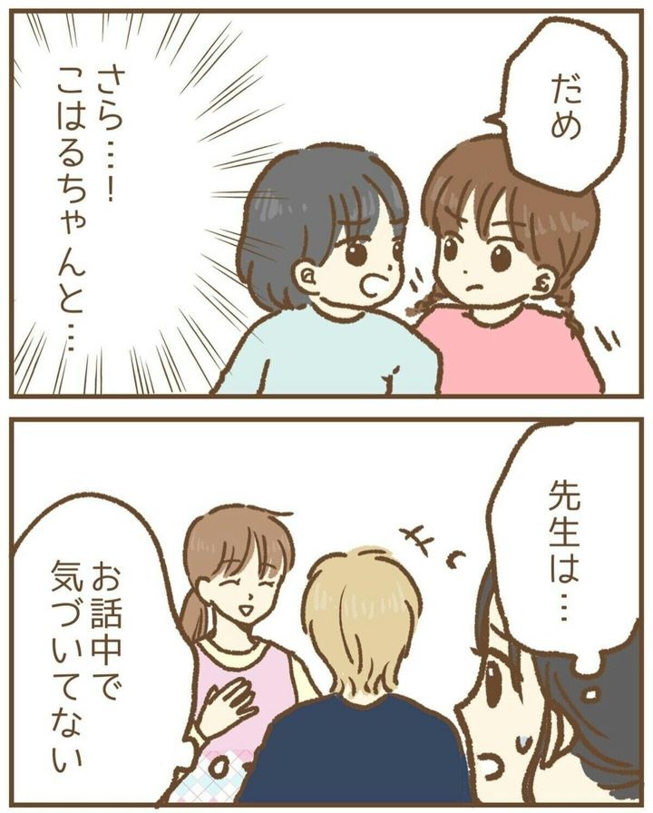 先生は他のママと話をしていて2人の様子に気付いていないようでした。またトラブルになるのを避けるため、さらちゃんに向けて「さら!意地悪しないよ」と声をかけたフォロワーさん。何事もなく済んだように見えますが、その様子を見ていたこはるちゃんのママは、怒っているようです。このあと園庭で謝罪を求められ、もめてしまったといいます。