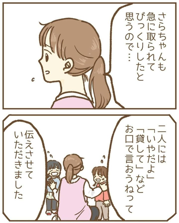 保育園へお迎えに行った際に娘・さらちゃんが友達のこはるちゃんをひっかいてしまったと先生から報告を受けたフォロワーさん。年少児では、まだまだ自分の気持ちを上手に言えなかったり、貸し借りがうまくできなかったりすることも。時には、故意ではなくケガをさせてしまうこともあるかもしれません。