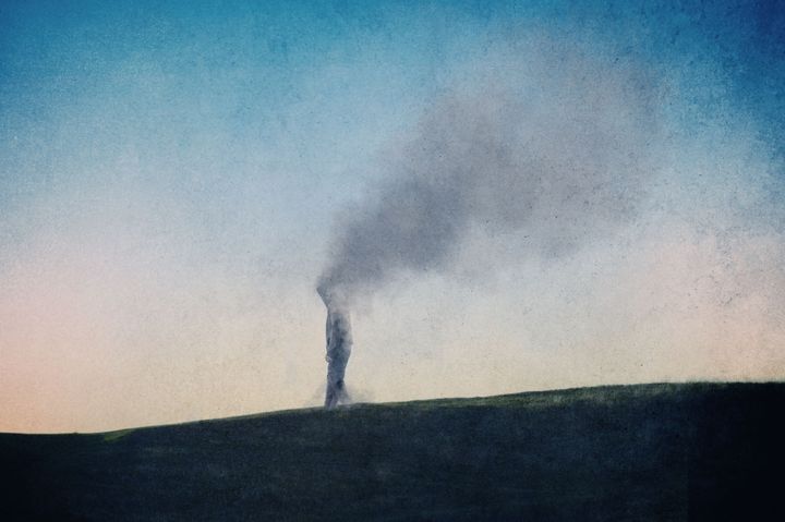 A mental health concept. Of a lonely figure vanishing into clouds. Silhouetted against the sky.