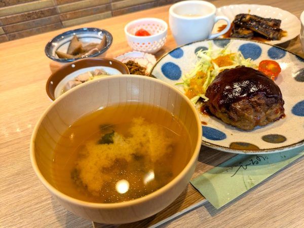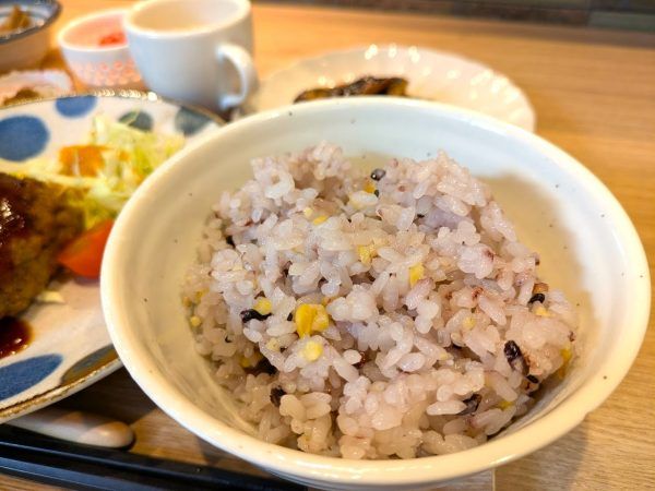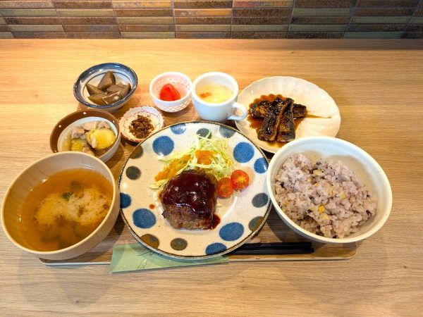 メイン、小鉢多数・お味噌汁・ご飯付きです。ご飯は、白ご飯か雑穀米ご飯が選べます。ご飯は雑穀米のご飯を選びました。平日のランチは、お肉のお食事・お魚のお食事が各1000円、お急ぎの方用にハヤシライスが900円です。メニューの内容は毎日変更されます。
