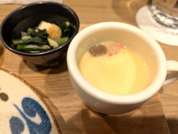 茶碗蒸しも付いて、デザートのようなトマトのシロップ漬けもいただきました。お得で健康的でおいしいお昼ごはんですね。