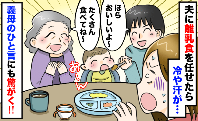義両親と同居しながら、7カ月になる長男を育てていたときのこと。少し手が離せなかったので、夫に赤ちゃんの離乳食をお願いしました。義母もそばにいたので安心して任せたのですが、しばらくしてリビングをのぞいたらゾッとする展開になっていて……。