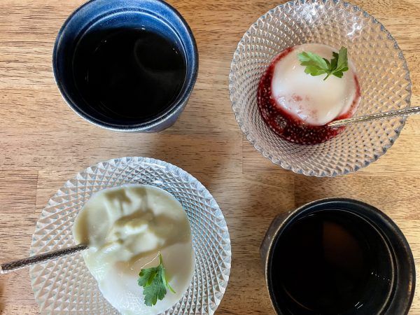 デザートは杏仁豆腐、ソースがハイビスカスソースと、期間限定のさつまいものソースと選べました。もちろん一つずつ。