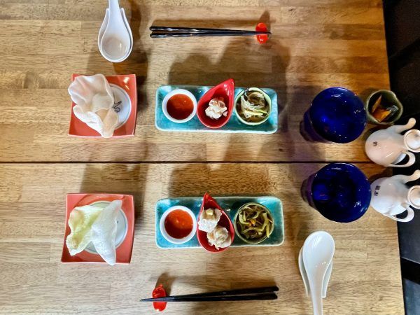 ハイビスカスソースはすっきり爽やか。さつまいものソースはこっくりと優しい甘さ。ジャスミン茶とともに。
