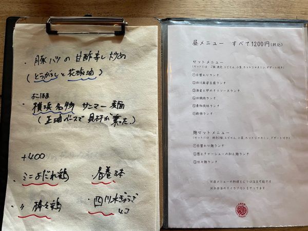 ランチセットはご飯の定食と麺と数種類から選べます。ちょっと見にくくてすみません。本日のご飯、麺もあるので、チェック!