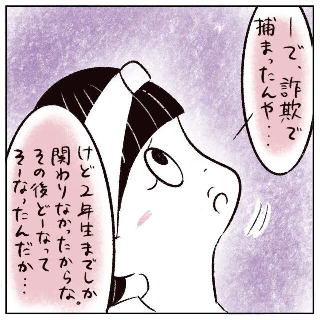 「-で、詐欺で捕まったんや・・・。けど、2年生までしか関わりなかったからな。その後どーなってそうーなったんだか・・・」大人になったさなかちゃんが少し前に詐欺で逮捕されたという話をお母さんから聞いたまるさんは、自分と関りがなくなってからのさなかちゃんがどんな人生を歩んでいたのかと考えました。