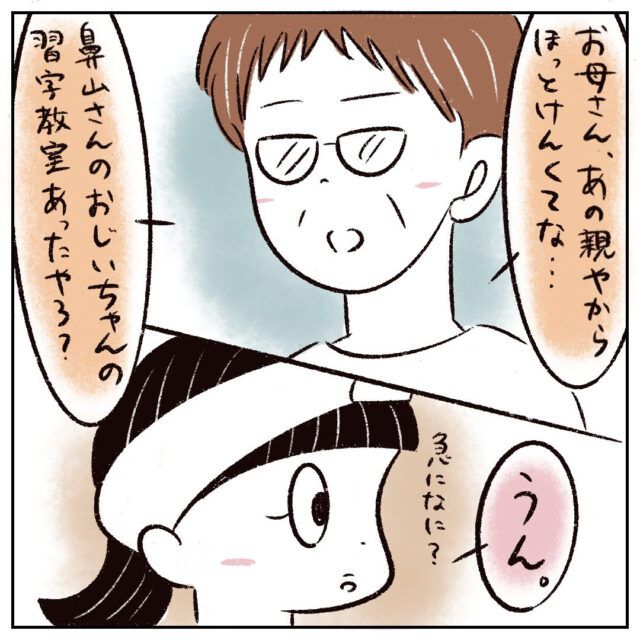 すると「お母さん、あの親やからほっとけんくてな・・・。鼻山さんのおじいちゃんの習字教室あったやろ?」と、さなかちゃんの話をしていたのに突然習字教室の話題を出したお母さん。まるさんは「うん。急になに?」と聞き返しました。