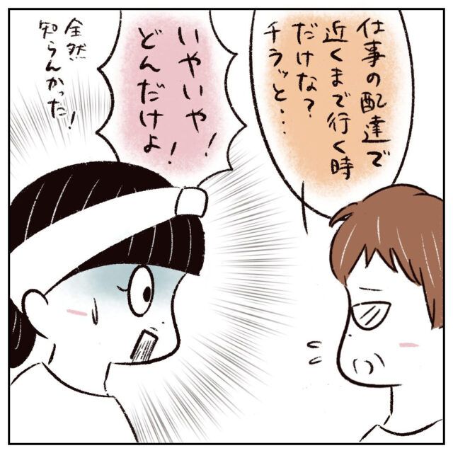 「仕事の配達で近くまで行く時だけな?チラッと・・・」と控えめに話すお母さんに「いやいや!どんだけよ!」とまるさんは突っ込みます。