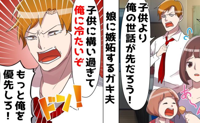 子どものお世話をするというのは、相手を特別扱いしたり甘やかしているわけではありません。子どもが将来困らないように、思いやりを持ってサポートをしているのです。子どもに嫉妬する夫が迎えた、因果応報の結末ですね。