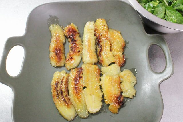 お皿に3のバナナを敷き、そぎ切りにした豚肉のソテーを乗せ、1のサラダを添えます。