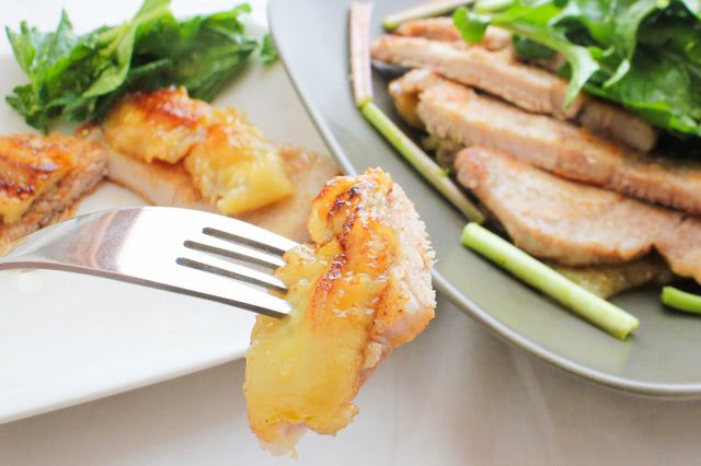 豚ロース肉もバナナも香ばしい焼き色が付いていて、とてもおいしそうです♪豚肉とバナナの組み合わせは初めてですが、どんなお味でしょう?