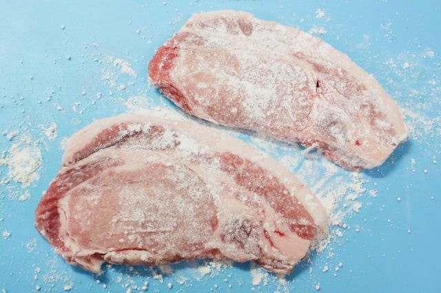 4. 豚ロース肉の筋を切り、両面に塩・こしょうを振って、薄力粉をはたきます。