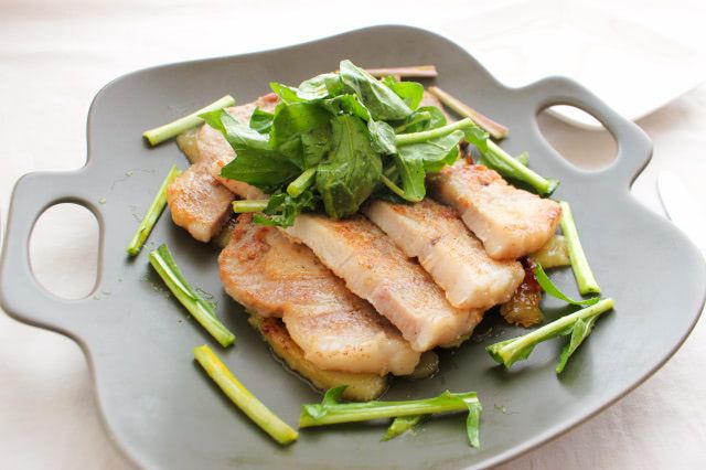 5. オリーブオイルとバターを引いたフライパンを中火で熱し、豚ロース肉がこんがりとするまで焼きます。