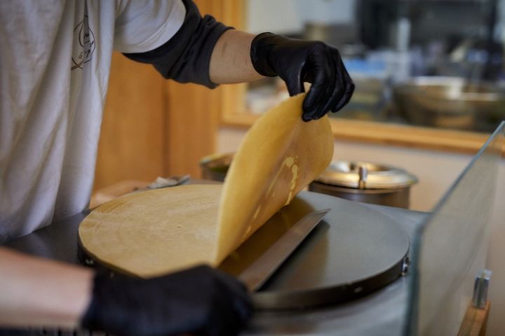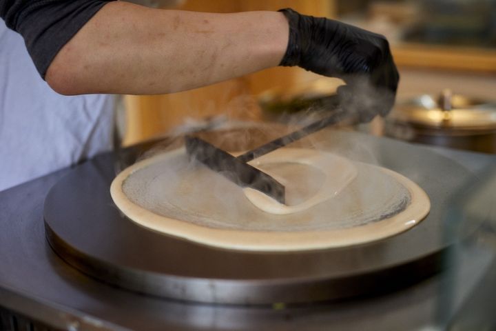 破れないか心配になるくらい薄く、大きく焼き上がったクレープ。持ち上げて蒸れた蒸気を逃してからデコレートしていきます。