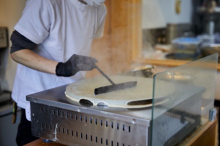 「クレープとエスプレッソと嵐山」のクレープの特徴はなんといっても生地の食感。約40㎝の焼き台にお玉になみなみ1杯分の生地を流し、トンボでくるりくるりと回しながら外周に向けて広げていきます。