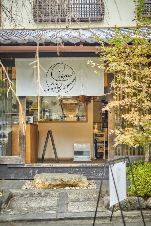 「パンとエスプレッソと嵐山庭園『パンと』」と「クレープとエスプレッソと嵐山」は、同じ建物内をゆるく仕切ってあり、入口も分かれています。「クレープとエスプレッソと嵐山」の入口にはクレープをモチーフにしたロゴの暖簾がかかっているので、目印にしてくださいね。