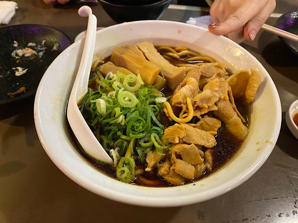 出ました!名物高井田中華そば。大阪の東側(東大阪など)で食べられている醤油ラーメンです。 スープの色が濃いので醤油味が濃いのかと思いきや、ほんのり甘味のある食べやすいスープです。 太めのラーメンにでっかいメンマや豚肉が合います。