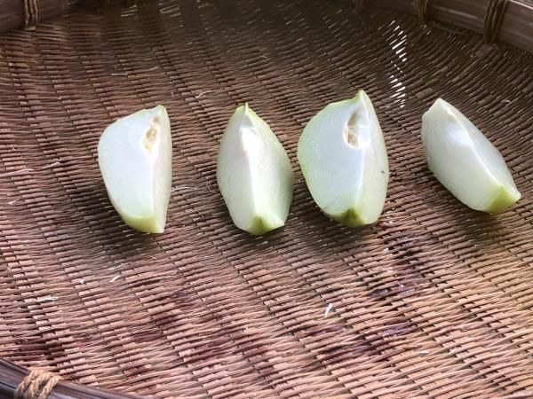 ①ハヤトウリの皮をむいて4つ切りにして、1日干します