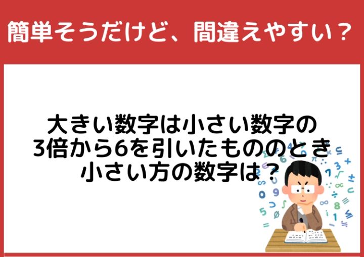 簡単そうだけど、間違えやすい?「大きい数字が小さい数字の3倍から6を引いたもののとき小さい方の数字」は?