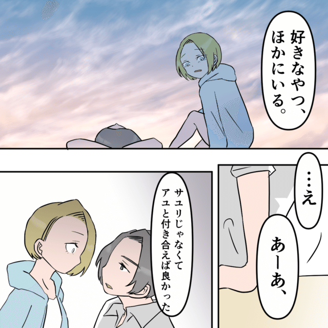 「あいつ、好きなヤツ、他にいる。」タクマが言ったことに動揺するアユに、タクマは「あーあ、サユリじゃなくてアユと付き合えば良かった。」と言ったのです。