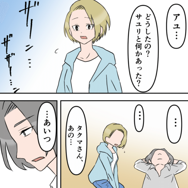 サユリの提案でアユとサユリは2人で旅行に行くことにしていましたが、一度は断られても諦めきれずにどうしてもサユリと旅行へ行きたいタクマからのたっての願いでアユはサユリを説得しタクマとタクマさんの友達カズヤも入れた4人で行くことになりました。綺麗な海と素敵なロッジハウスにテンションが上がりはしゃぐアユとサユリとは対照的に、てっきり彼女のサユリと一緒の部屋に泊まると思っていたタクマは、サユリに断固拒否されて落ち込みました。その夜、不満を募らせながらすごいピッチでお酒を飲んでべろべろに酔っぱらってしまったタクマを部屋に送ったサユリ。するとすぐにケンカのような大声がして、タクマが部屋を飛び出して行きました。