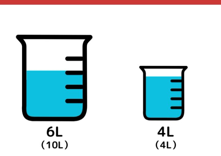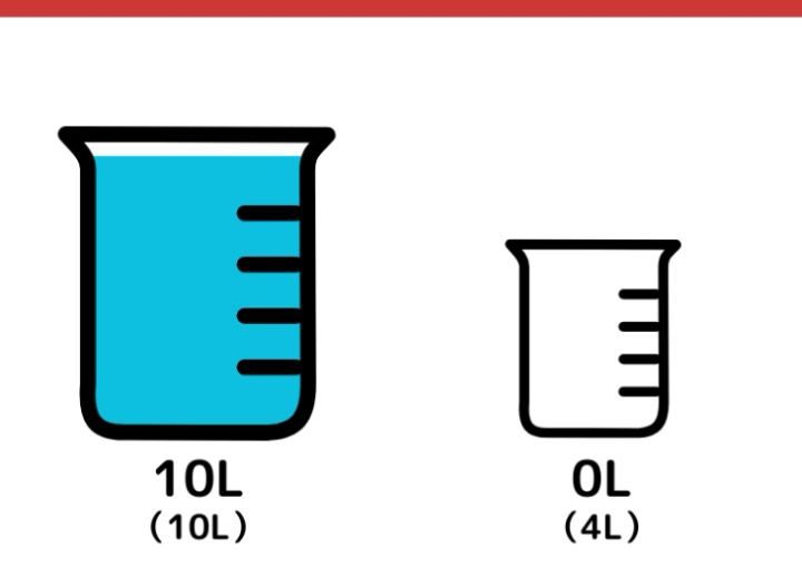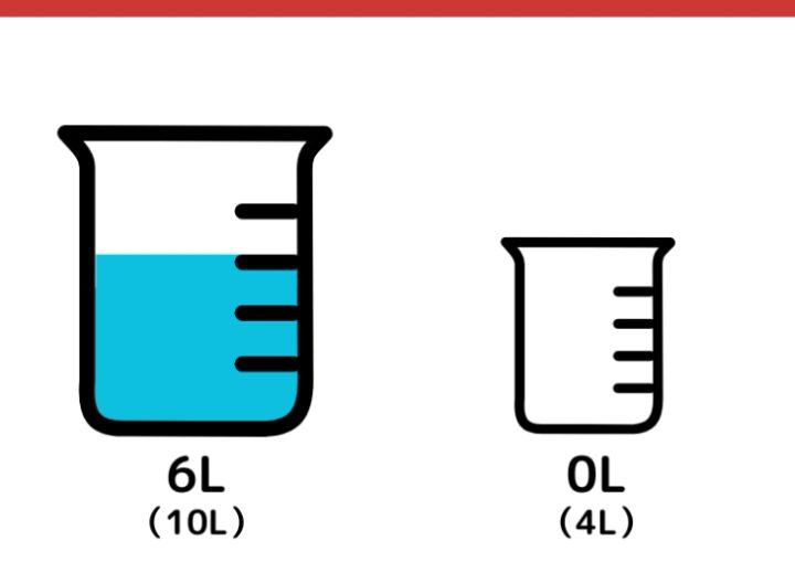 10Lの容器から4Lの容器に水を移します。すると10Lの容器には6Lの水が残ります。