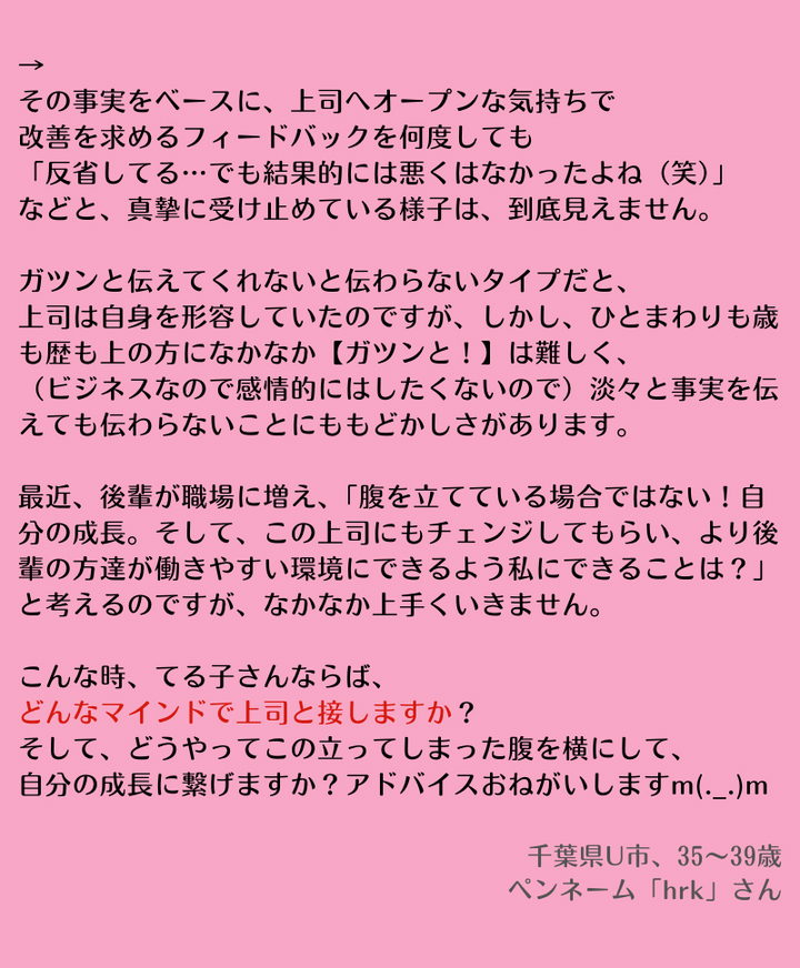 あたしがもしhrkさんだったら、この上司にフィードバックするとなったときに、「今回は怒りを感じる場面がありました」と、自分の気持ちを冷静に、でもはっきりと、あえて文字に起こして伝えるでしょう。