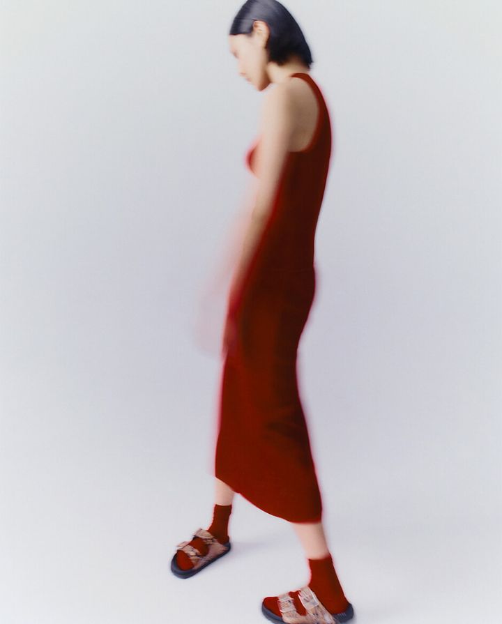 それぞれのカラーはベージュとレッドの2色で展開され、ブラックレザーで覆われたフットベッドと、ゴールドまたはシルバーのバックルが特徴となっている。