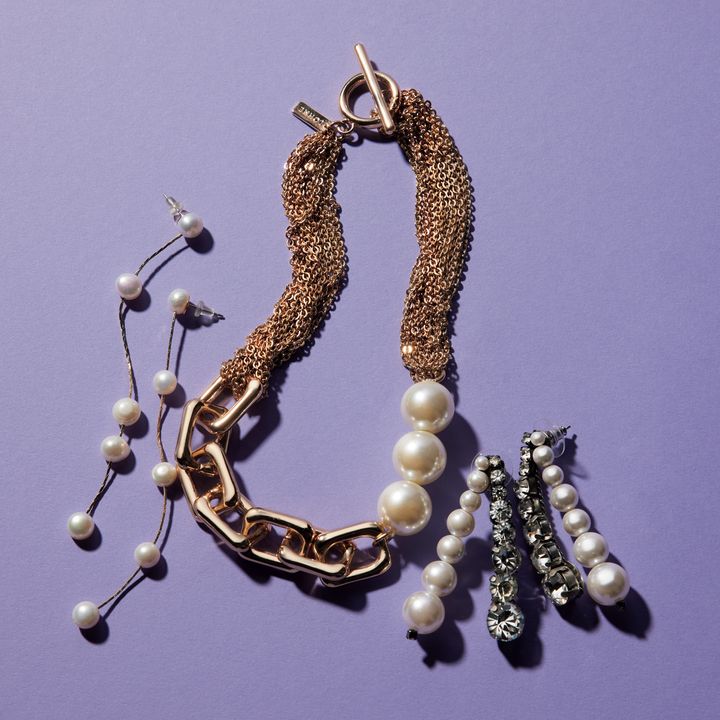 左から:5 粒縦パールピアス¥8,470(エティカ/ ZUTTOHOLIC)ネックレス¥19,800(ローム) パール×ビジューピアス¥22,000(ラダ/ルル・ウィルビー/アルアバイル)