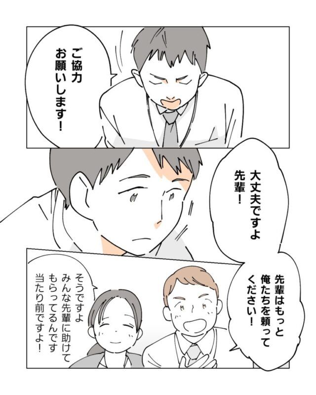 「ご協力お願いします!」そう言って頭を下げる良平さんに、「大丈夫ですよ先輩!先輩はもっと俺たちを頼ってください!」「そうですよ。みんな先輩に助けてもらってるんです。当たり前ですよ!」後輩たちは温かい言葉をかけてくれました。