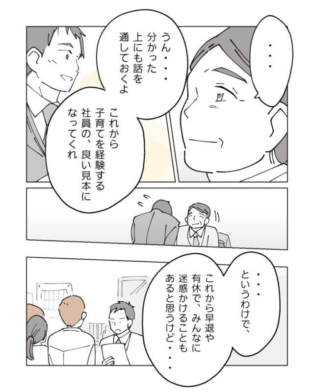 上司に保育園の緊急連絡先を自分自身の連絡先に変更したいと申し出た良平さん、すると「・・うん。わかった。上にも話を通しておくよ。これから子育てを経験する社員の、良い見本になってくれ」と快く受け入れてもらいました。そして部署に戻った後、「・・・というわけで、これから早退や有休でみんなに迷惑かけることもあると思うけど・・」とみんなに話します。