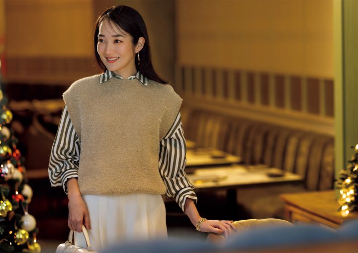 非日常のおしゃれを楽しむ高揚感を、繊細な輝きを織り込んだニットベストに託して。きちんとした着こなしが、品格は保ったまま一発できらめくスタイリングに。